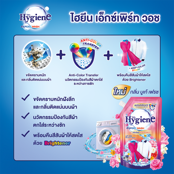 ไฮยีน น้ำยาซักผ้า กลิ่น บูเก้ เฟรช สัมผัสนวัตกรรมการซักผ้าที่เหนือกว่าด้วย ไฮยีน เอ็กซ์เพิร์ท วอช สูตรป้องกันสีผ้าตกใส่ ที่ผสานเทคโนโลยีล้ำสมัย Anti-Color Transfer ช่วยป้องกันสีผ้าตกใส่ระหว่างการซักอย่างมีประสิทธิภาพ ให้คุณมั่นใจในทุกการซักโดยไม่ต้องแยกผ้า ประหยัดเวลาและเพิ่มความสะดวกในการดูแลเสื้อผ้าของคุณ
