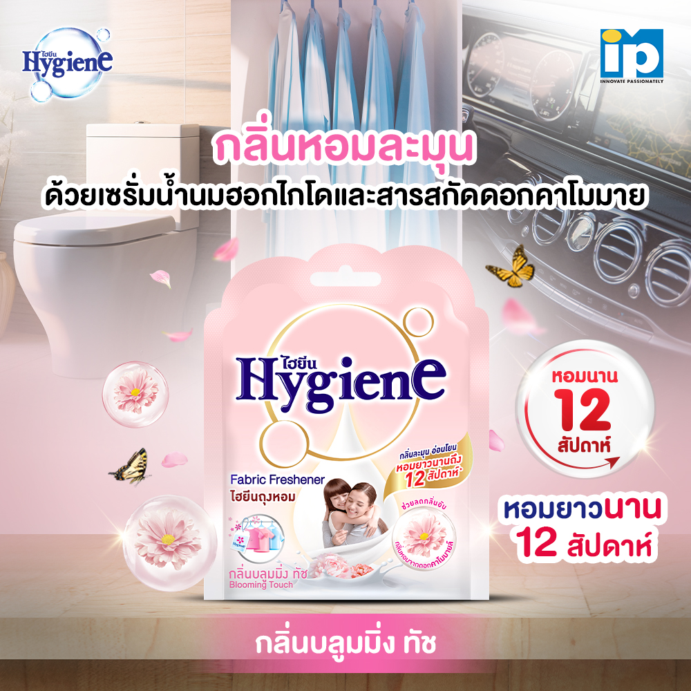 ไฮยีน ถุงหอม กลิ่นบลูมมิ่ง ทัช อุดมไปด้วย กลิ่นหอมละมุนจากเซรั่มน้ำนมฮอกไกโดและสารสกัดดอกคาโมมายล์ ที่ช่วยมอบสัมผัสอ่อนโยน พร้อมกระจายความหอมอย่างนุ่มนวลและผ่อนคลาย พร้อมเม็ดหอมที่ช่วยกระจายความหอมอย่างต่อเนื่อง ให้พื้นที่ของคุณสดชื่นยาวนานถึง 12 สัปดาห์ ช่วยขจัดกลิ่นอับใน ตู้เสื้อผ้า, ลิ้นชัก, รถยนต์, ห้องน้ำ หรือทุกบริเวณที่ต้องการ ใช้งานง่าย เพียงแขวนหรือวางในจุดที่ต้องการ ให้บรรยากาศหอมสดชื่นได้ทุกวัน
