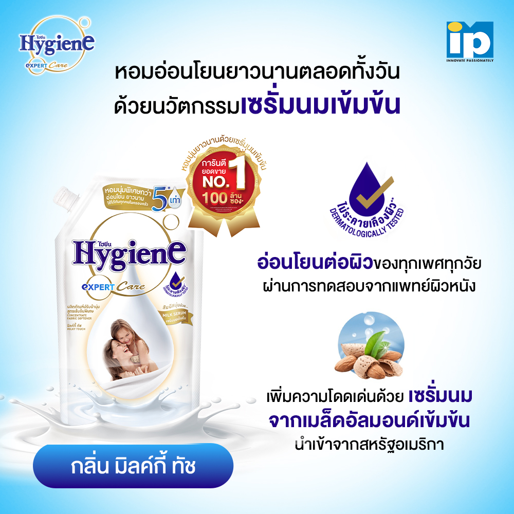 ไฮยีน น้ำยาปรับผ้านุ่ม กลิ่นมิลค์กี้ ทัช หอมนุ่มพิเศษเข้มข้นกว่า 5 เท่า เติมเต็มกลิ่นหอมให้เสื้อผ้าของคุณ อ่อนโยนทุกสัมผัสตลอดทั้งวัน เพิ่มความโดดเด่นด้วยเซรั่มนมจากเมล็ดอัลมอนด์เข้มข้นนำเข้าจากสหรัฐอเมริกา การันตีความหอมอันดับ 1 ของไฮยีน ด้วยยอดขายกว่า 100 ล้านซอง