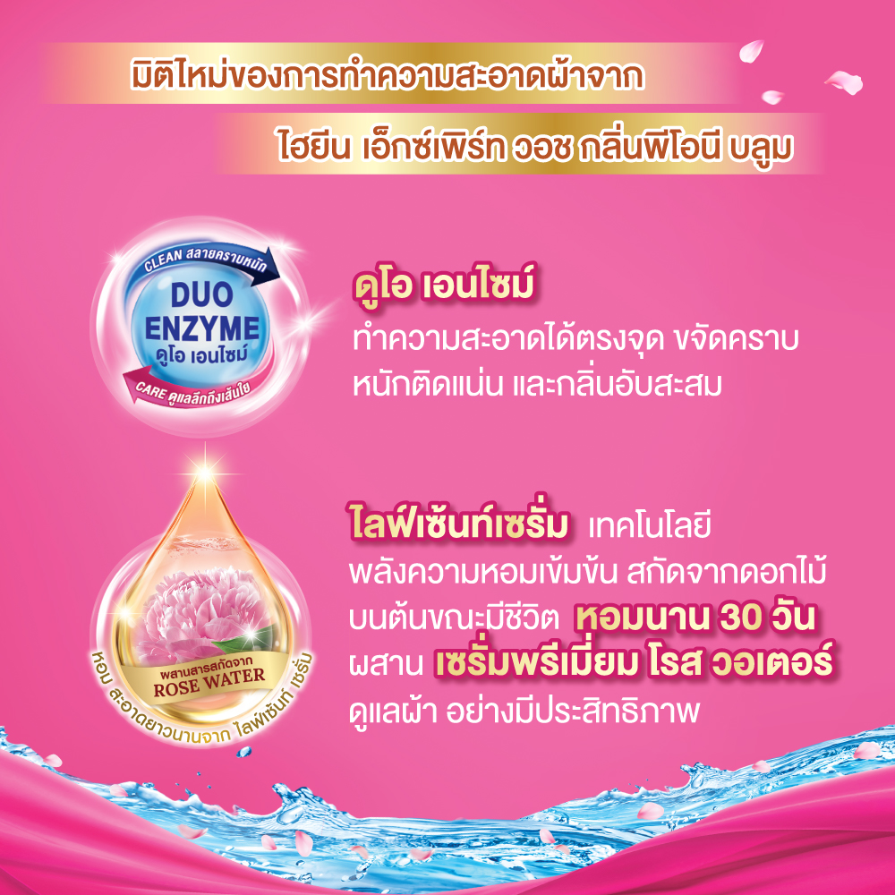 ไฮยีน น้ำยาซักผ้า กลิ่นพีโอนี บลูม ยกระดับประสบการณ์การซักผ้าด้วยเทคโนโลยี Duo Enzyme ที่ผสานพลังการทำความสะอาดและความหอมไว้ในหนึ่งเดียว ด้วย 2 แอคชั่นทรงพลังที่ทำงานพร้อมกันในทุกการซัก เพื่อเสื้อผ้าที่สะอาดหมดจดและหอมสดชื่นตลอดวัน ขจัดคราบลึกและกำจัดกลิ่นฝังแน่น มั่นใจได้ในประสิทธิภาพการซักที่เหนือกว่า ไม่ว่าคราบหนักหรือกลิ่นอับใดๆ ที่เกิดจากกิจกรรมต่างๆ อาทิ กลิ่นเหงื่อหลังออกกำลังกาย กลิ่นตัวจากการเดินทางระหว่างวัน หรือกลิ่นสะสมจากกิจกรรมกลางแจ้งและการทำงานหนัก และยังมอบพลังความหอมสดชื่นที่ติดทนตลอดวัน ด้วยแอคชั่นปล่อยกลิ่นหอมอัตโนมัติทุกครั้งที่คุณขยับตัว ให้คุณรู้สึกสดชื่นเหมือนเพิ่งซักผ้าใหม่ตลอดเวลา