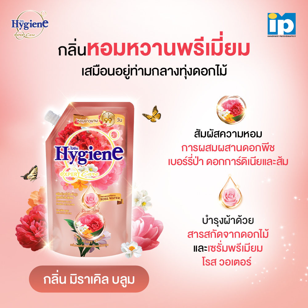 ไฮยีน น้ำยาปรับผ้านุ่ม กลิ่น มิราเคิล บลูม สัมผัสกลิ่นหอมหวาน พรีเมี่ยม เสมือนอยู่ท่ามกลาง ทุ่งดอกไม้แสนละมุน จากการผสมผสานความหอมสดใสของ ดอกพีช และ เบอร์รี่ป่า เข้ากับความหรูหราของ ดอกการ์ดิเนีย และความสดชื่นจาก ส้ม มอบเสน่ห์อันน่าหลงใหลที่หอมตราตรึงในทุกสัมผัส